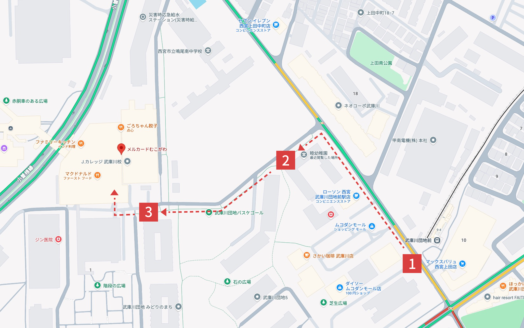 右手側にメルカードむこがわが見えてきます。当店は1Fにございます。(コープこうべ様近くです)